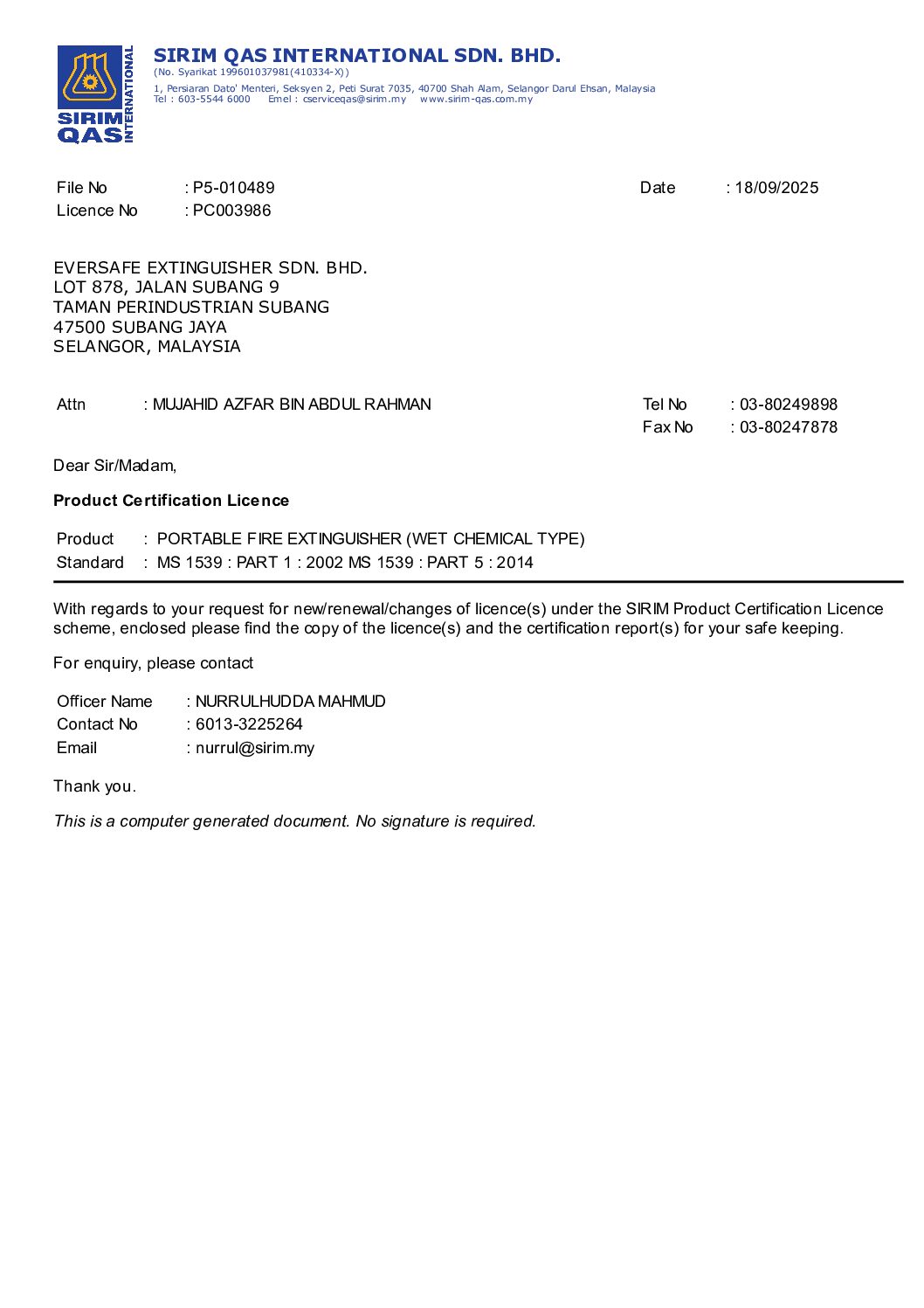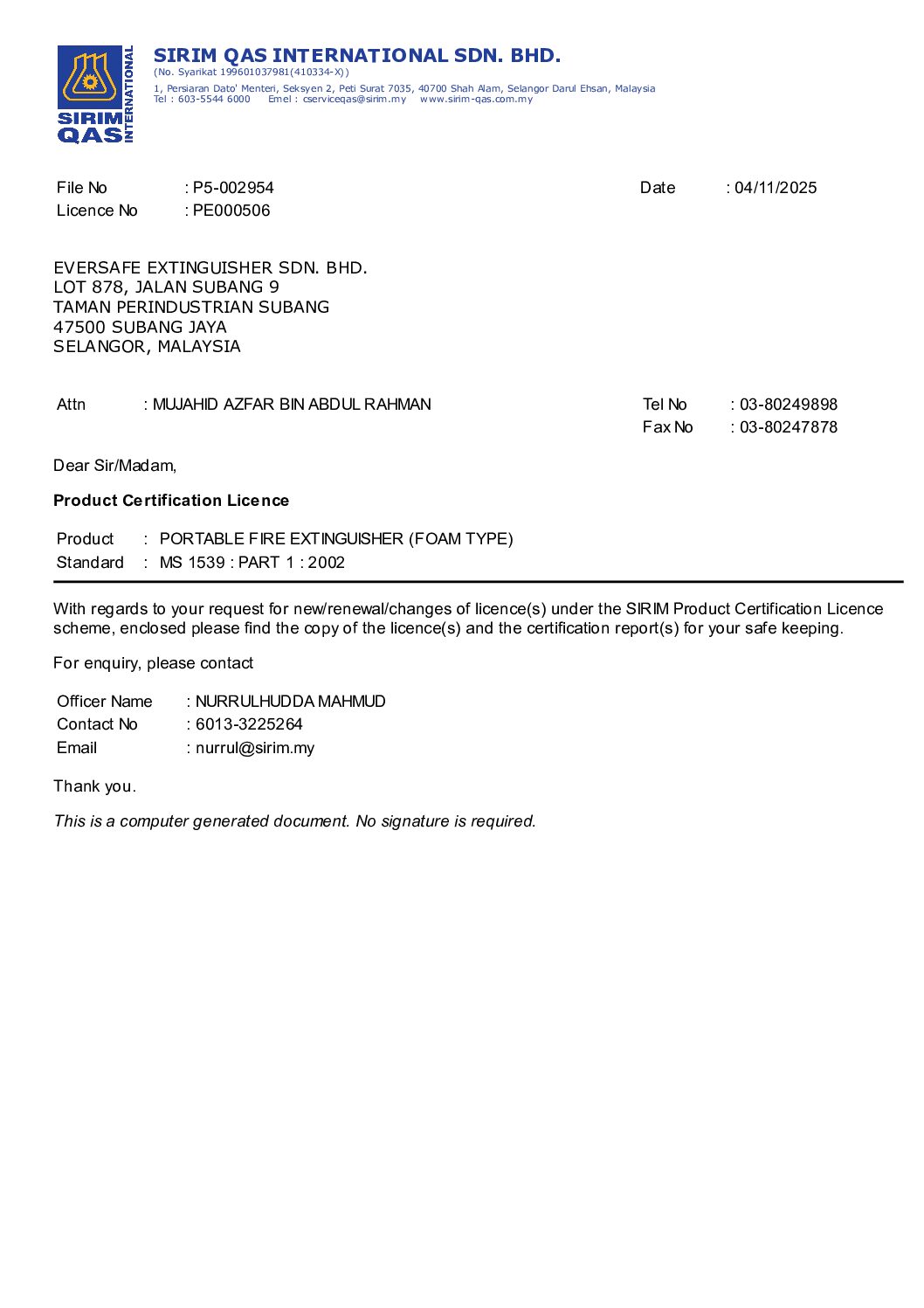 SIRIM CERTIFICATE FOAM PFE (PE000506)