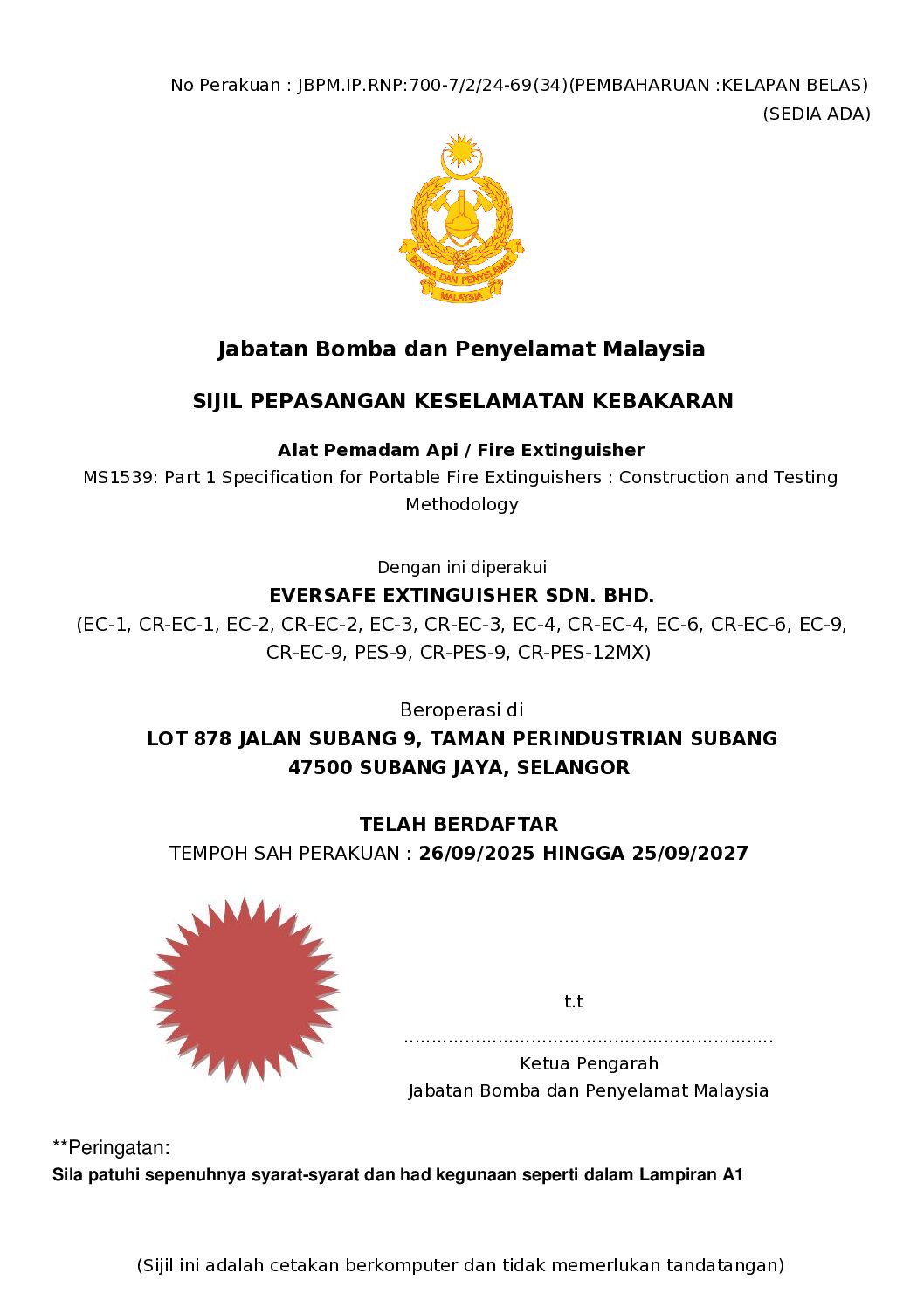 BOMBA CERTIFICATE FIRE ALARM BELL (JBPM.IP.RNP: 700-7/2/15-8 (25))