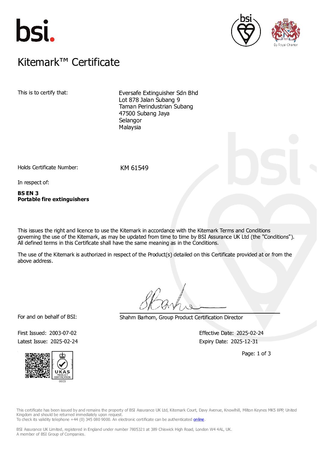 BSI CERTIFICATE KITEMARK PORTABLE FIRE EXTINGUISHER (KM 61549)
